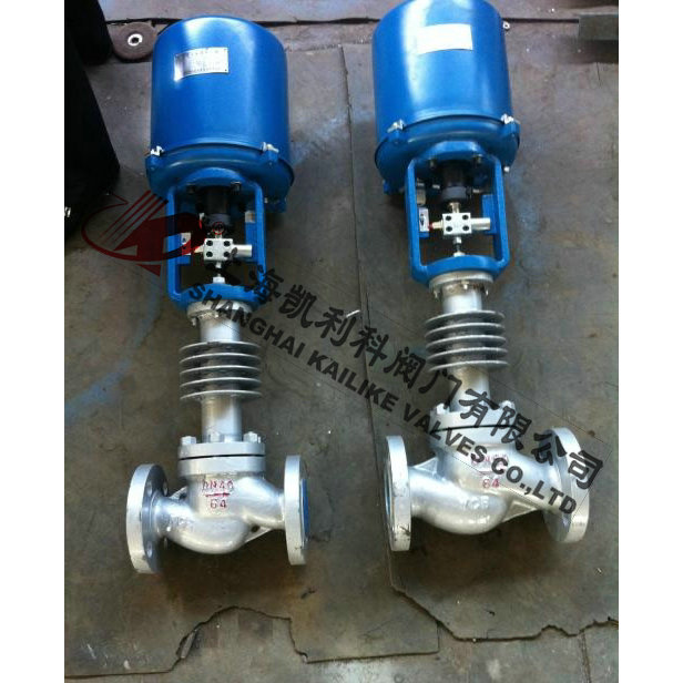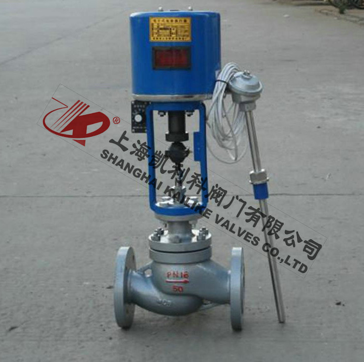 由單座調節閥、電動執行機構、溫度傳感器和溫度調節器等部件組成,根據用戶需要,分别有加熱型與冷卻型兩種結構。加熱型調節閥的結構與原理,工作前主閥芯處于半開位置,傳感器處于自然狀态。接上電源,主閥芯全開。介質由箭頭方向流入主閥體、經閥芯對儲熱箱進行加熱。當溫度升到相應設定值時,傳感器即産生相應線性信号輸入一體化執行機構,随即驅動閥杆、閥芯産生位移,關閉主閥芯停止加熱。當溫度低于設定值時,傳感器即産生線性信号輸入一體化執行機構,驅使閥芯漸開,使介質按抛物線特性流入儲熱箱,進行加熱直至設定值。這樣被控介質始終在設定溫度範圍内被控制,從而達到控溫目的。